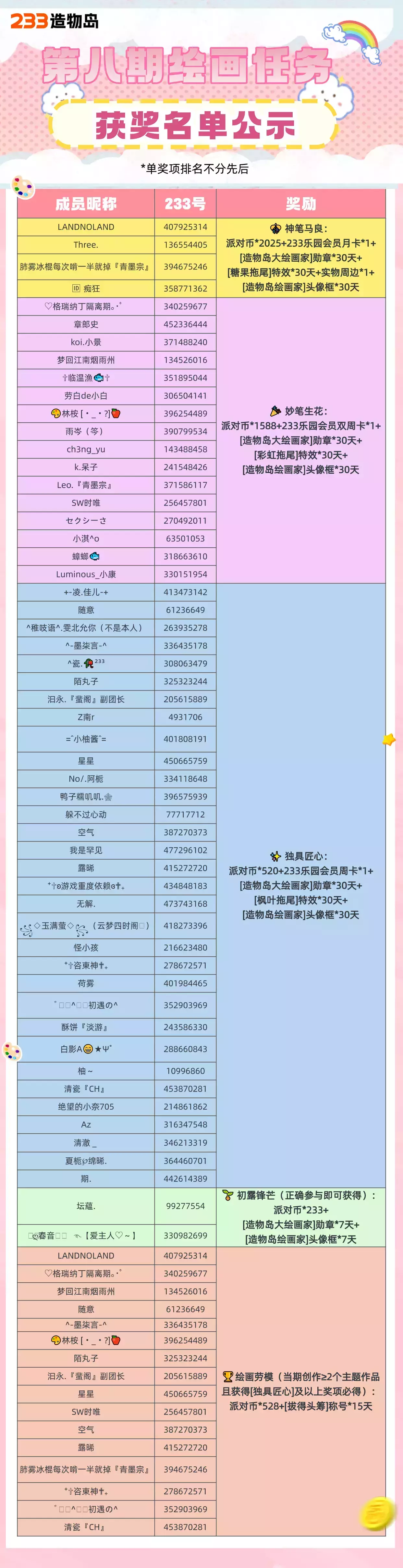 🏆绘画劳模(当期创作≥2个主题作品且获得[独具匠心]及以上奖项必得):派对币*528+[拔得头筹]称号*15天