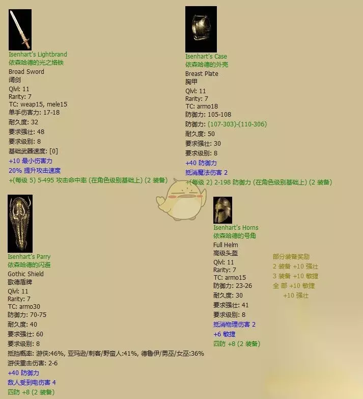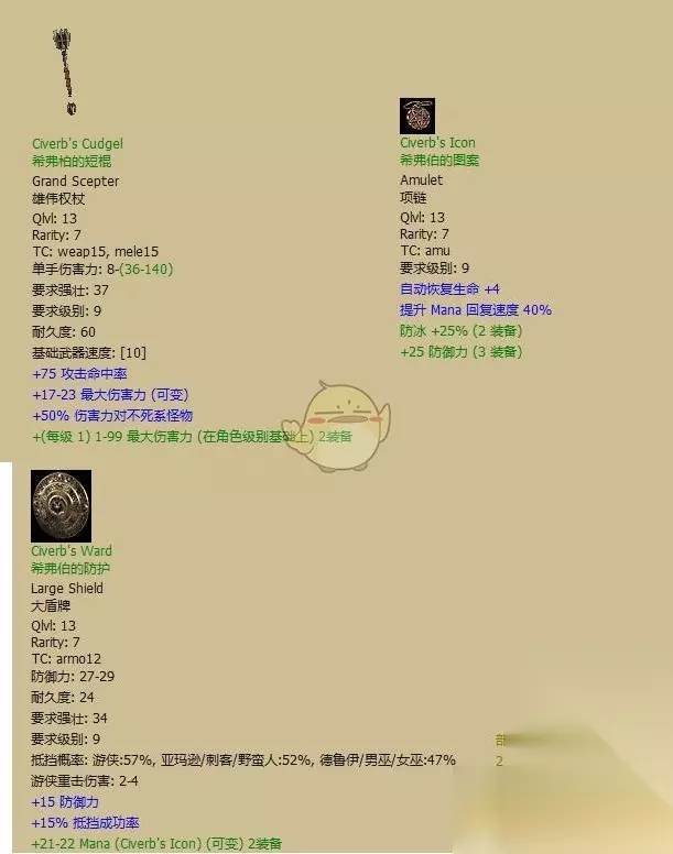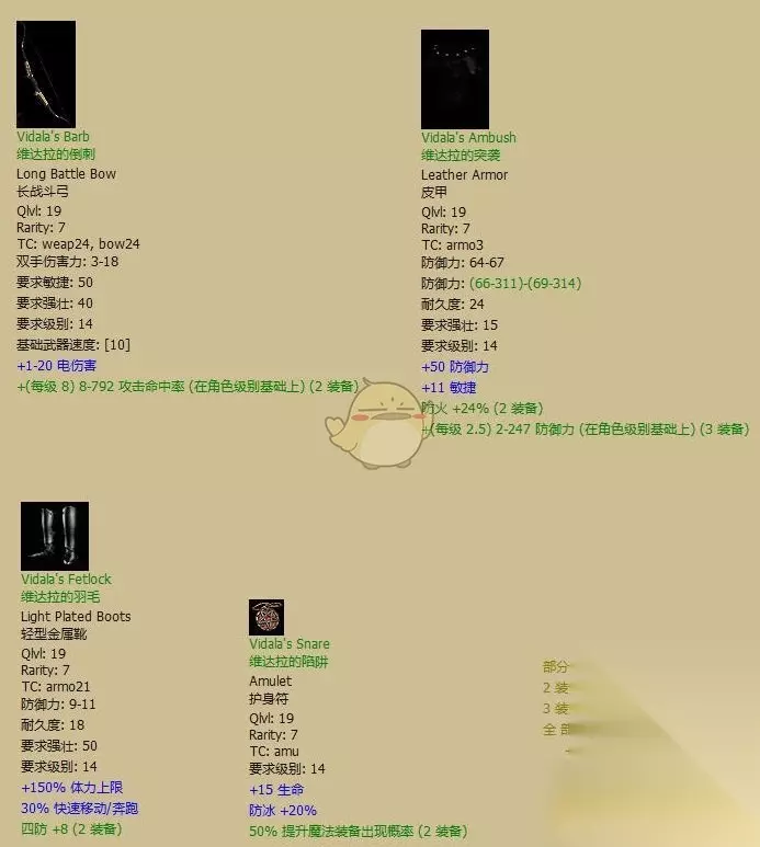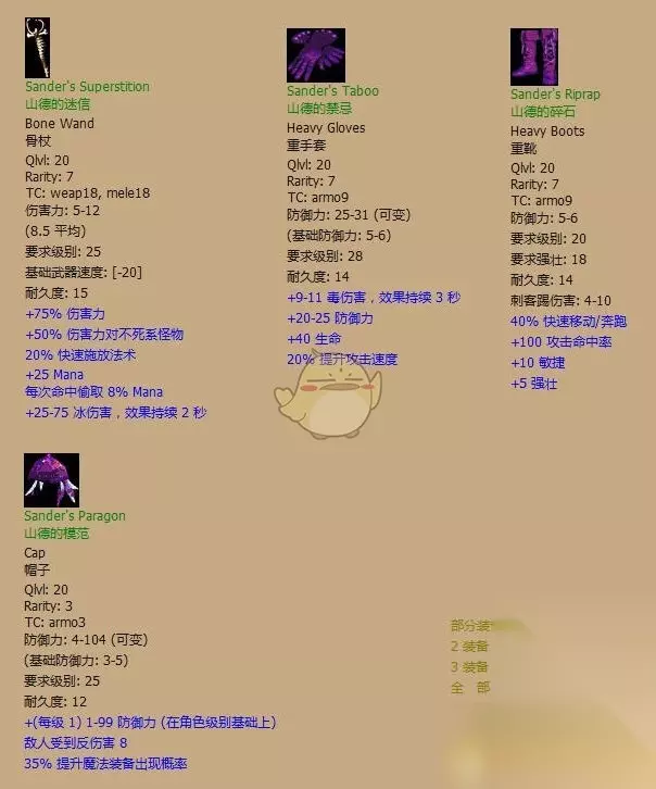最常见的套装。相信大部分玩家最先凑齐的绿套都是这套或者哈斯拉伯套 全套评价:B。全套穿齐提供的属性对近战系来说齐全而稳定。虽然数值都不够大,但初期完全够用了。因为没有附加伤害,到普通难度后期会有点力不从心。 有用散件:无。 镶法:有啥镶啥 «12345678910»友情提示:支持键盘左右键"←""→"翻页 希弗伯的法衣(Civerb's Vestments)
