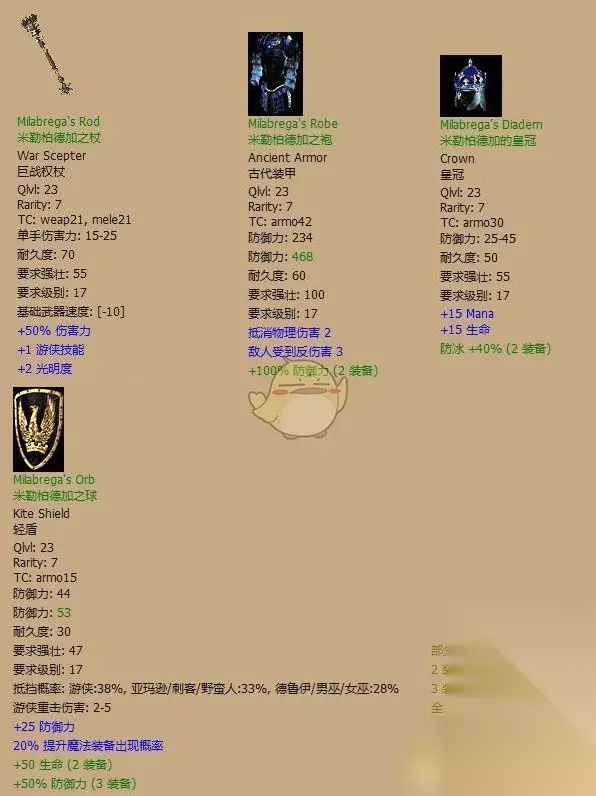 吐槽一下:SOR居然有4套套装……不愧是亲女儿啊,嫁妆丰厚 全套评价:C。加了一大堆法力、生命、FCR、MF,问题是最最关键的技能居然只+1级!完全没使用价值嘛…… 有用散件:无。纯收藏品 镶法:懒得说了…… «234567891011»友情提示:支持键盘左右键"←""→"翻页 米拉伯佳的雪茄(Milabrega's Regalia)