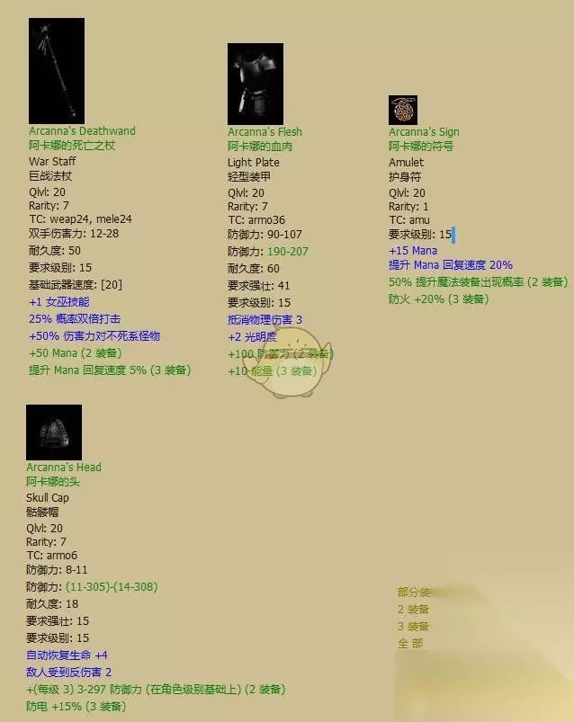 很容易出的套装之一。项链是最容易出的绿项链,也是众多虫子爱好者咬牙切齿的物品 全套评价:C+。要不是有那个杖就是C了……除了点抗性,STR和DED之外几乎没有物理系可用的属性。还有那个40%MANA回复是什么鬼…… 有用散件:唯一有用的就是杖,在初期伤害可以算数一数二了,打过普通难度没问题。注意:这个杖有个隐藏的变量,固定加的最大伤害是在17-23之间变动的,变量补丁也显示不出来。因为底材WSM慢的缘故,需要配合其他提速装备使用。 镶法:武器+个MAX珠或者宝石都行。其他随意 «12345678910»友情提示:支持键盘左右键"←""→"翻页 天上的衣服(Angelic Raiment)