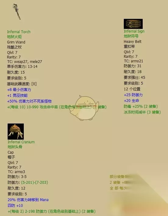 最容易凑齐的套装之一,尤其是鞋子简直满地都是…… 全套评价:B。以3级的等级需求,能有这样的性能已经无需强求了。初期另一个防冻的选择,而且凑齐一套很容易。如果没有死亡套,用这一套+两件西刚(必须包括手套)搭配不错。 有用散件:鞋子需求很低,有FR和FRW,开荒初期出了算小惊喜。 镶法:随便。 «12345678910»友情提示:支持键盘左右键"←""→"翻页 地狱工具((Infernal Tools)