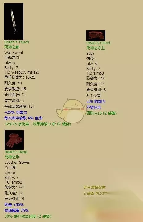 NEC初期价廉物美套装。杖的颜色很亮眼,但头实在太难看了…… 全套评价:B。5级就能+2NEC全技能,你还要求啥呢?+3骷髅支配3骷髅复生的杖运气不好几个小时都刷不出来,而且还得配个+伤害加深的盾才能达到这一套的效果。懒得反复刷商店的偶一直用这套练NEC小号。 有用散件:无。帽子是20小,但并不算太难出,至少比山德帽子好出多了。 镶法:忽略不计 «12345678910»友情提示:支持键盘左右键"←""→"翻页 死亡的伪装(Death's Disguise)