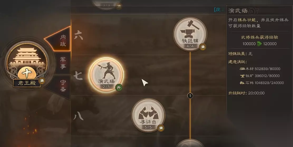 讨伐野怪也是高效获取经验的途径,每次消耗15点体力和1个策书,不仅能获得经验还能顺便收集装备材料和资源。前期可以多打低级野怪积累锻造材料,后期建议专注挑战9级以上的高级野怪。演武场练兵功能在君王殿7级后解锁,消耗30体力和铜币进行1小时训练,演武场等级越高获得的经验越多,这是后期培养新武将的主要方式。
