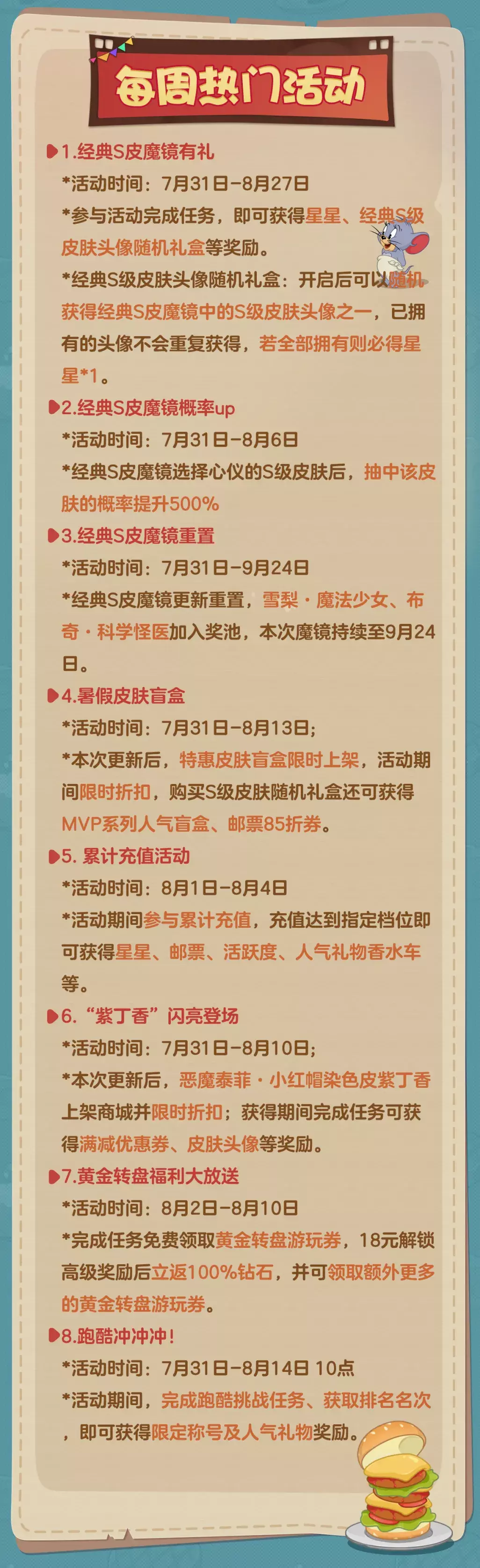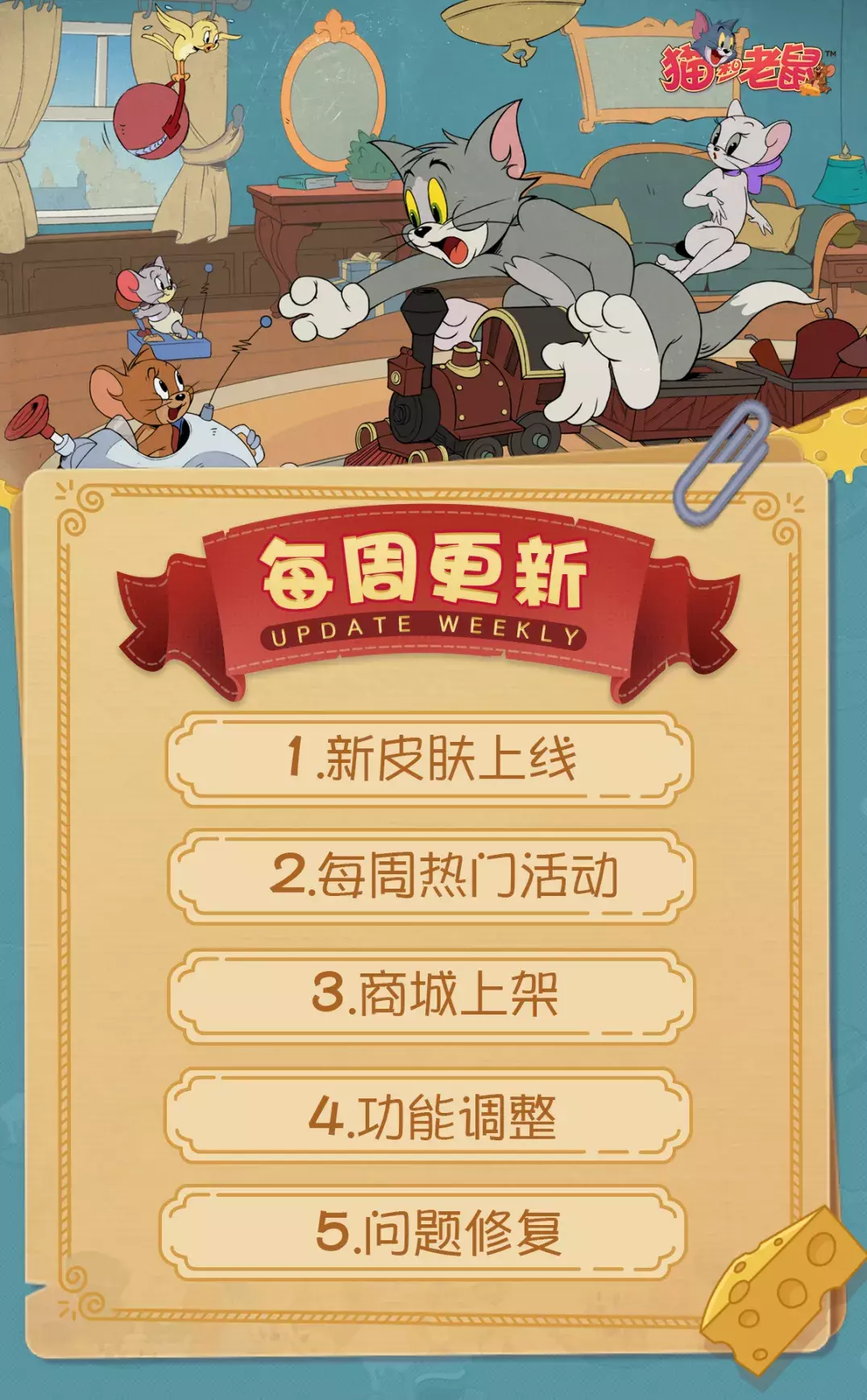 以上就是本周(7月31日)更新维护的全部内容啦!感谢小伙伴们对于《猫和老鼠》手游的支持和喜爱,愿欢乐永远陪伴大家左右!