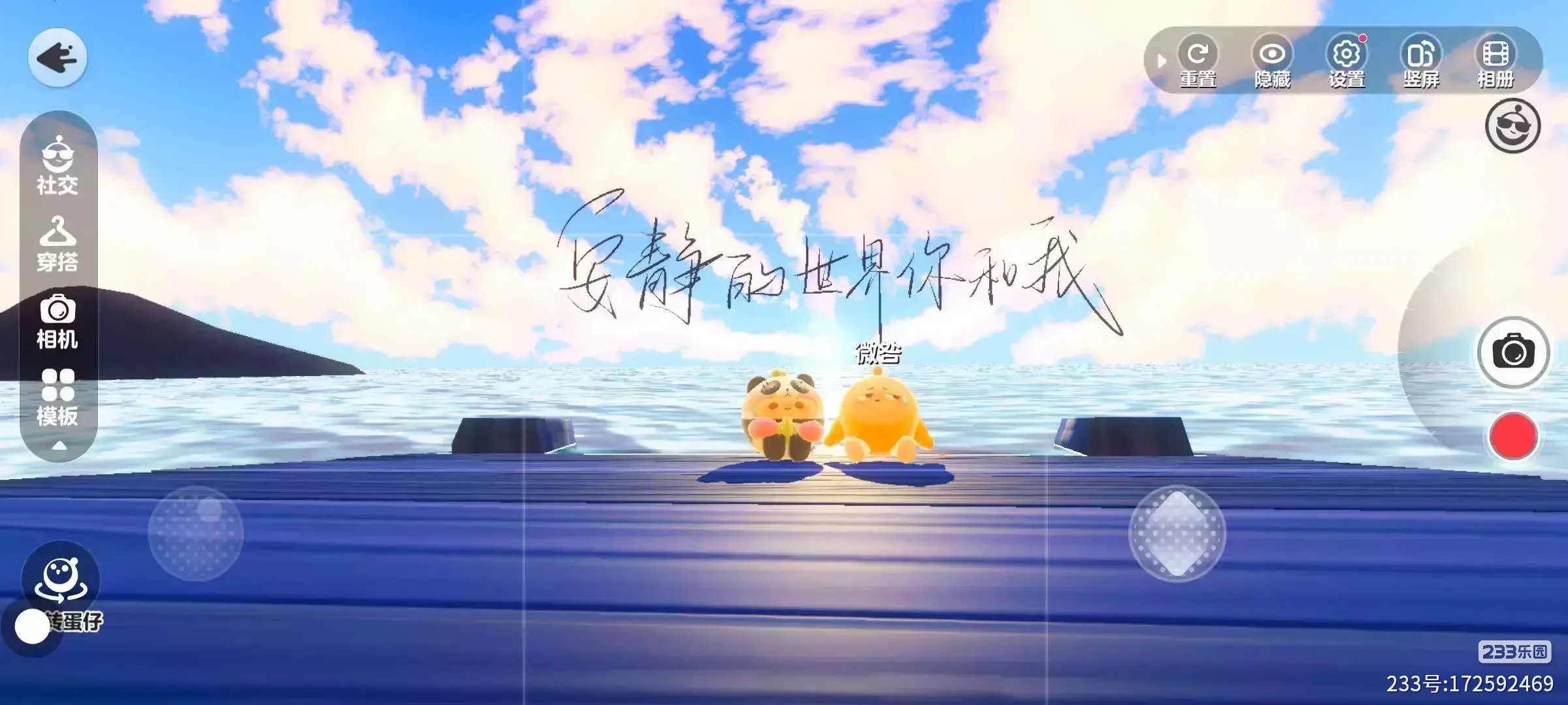 天空湛蓝,云朵蓬松似棉,水面波光粼粼,蓝色平台简洁开阔。画面中两个可爱蛋仔相伴,配上“安静的世界你和我”文字,营造出宁静、温馨氛围,给人闲适治愈之感,仿佛能让人暂离喧嚣,沉浸在这静谧美好的小天地 ,很适合好友间分享温馨时刻。