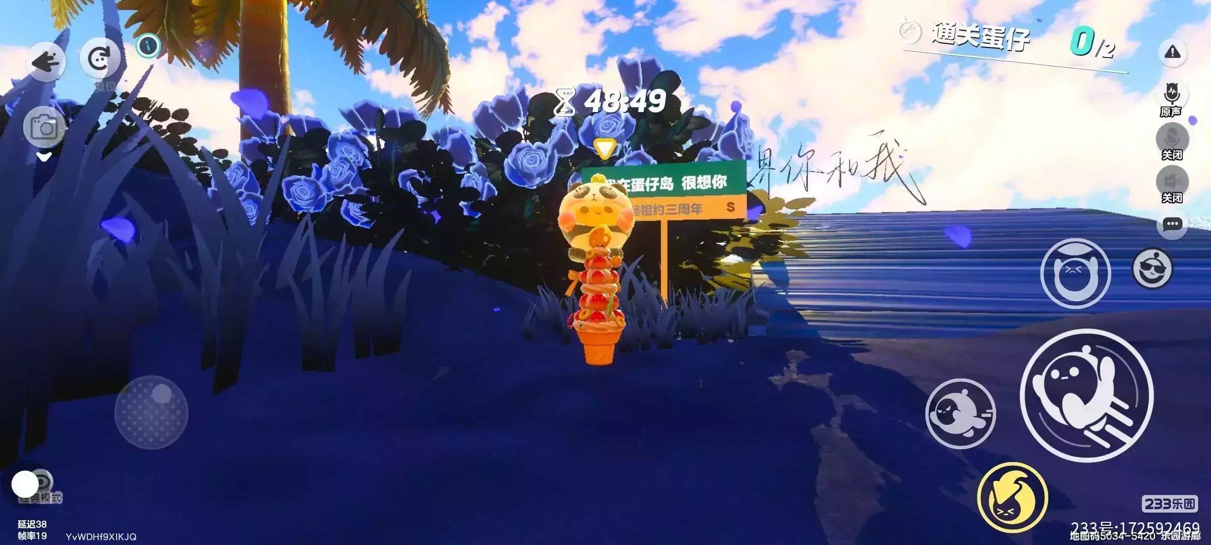 画面里,蓝紫色调铺陈,蓝色玫瑰丛明艳,花朵散发梦幻光泽,“我在蛋仔岛 很想你”标牌添浪漫。两个蛋仔叠坐,憨态可掬,背景海天相接,云朵、水波呼应,整体氛围温馨又治愈,满是童话感,适合记录美好情谊,定格蛋仔岛的浪漫瞬间 。这片小天地,像是把温柔揉碎了洒进来。大片浓郁蓝紫色铺满视野,神秘又浪漫,蓝色玫瑰肆意盛放,花瓣泛着剔透光泽,仿佛藏着细碎星光。“我在蛋仔岛 很想你”的牌子,把思念轻轻落在场景里,叠在一起的蛋仔软乎乎,透着亲昵。远处海天交融,云朵慢悠悠飘,水波也跟着晃,整个画面像裹着糖霜的梦,满是治愈与美好,专属于蛋仔们的浪漫小角落,待在这里,烦恼都能被暖化啦~