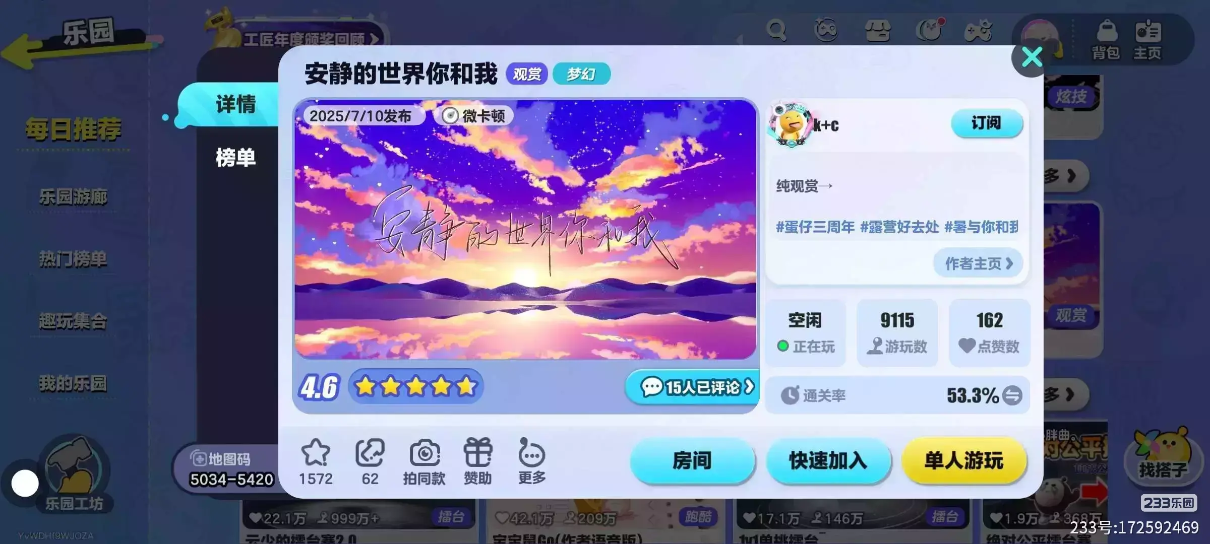 《蛋仔派对》“安静的世界你和我” 地图,以蓝紫色为主调,营造出温柔静谧氛围。可爱蛋仔相伴同行,大黑企鹅俏皮 “引导”,椰子树、大海、蓝天交织成浪漫背景,蓝花拱门似童话入口,50分钟倒计时传递悠然节奏,处处藏着治愈细节,是能让人放下喧嚣,沉浸式感受美好与陪伴的温馨小天地 。
