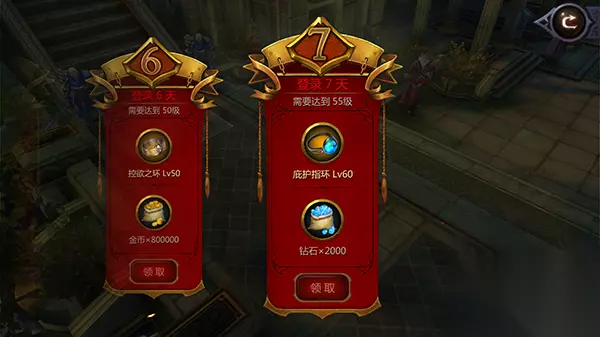 五、登陆奖励 完成七天登陆任务即可领取高级装备。最高可获得60级金色装备。 困难指数:☆ 收益指数:☆☆☆☆☆