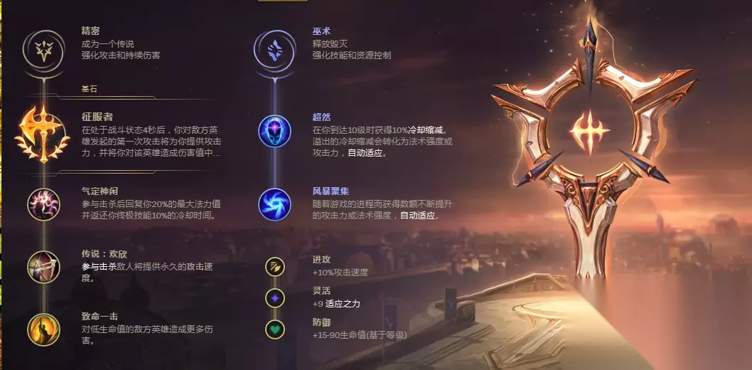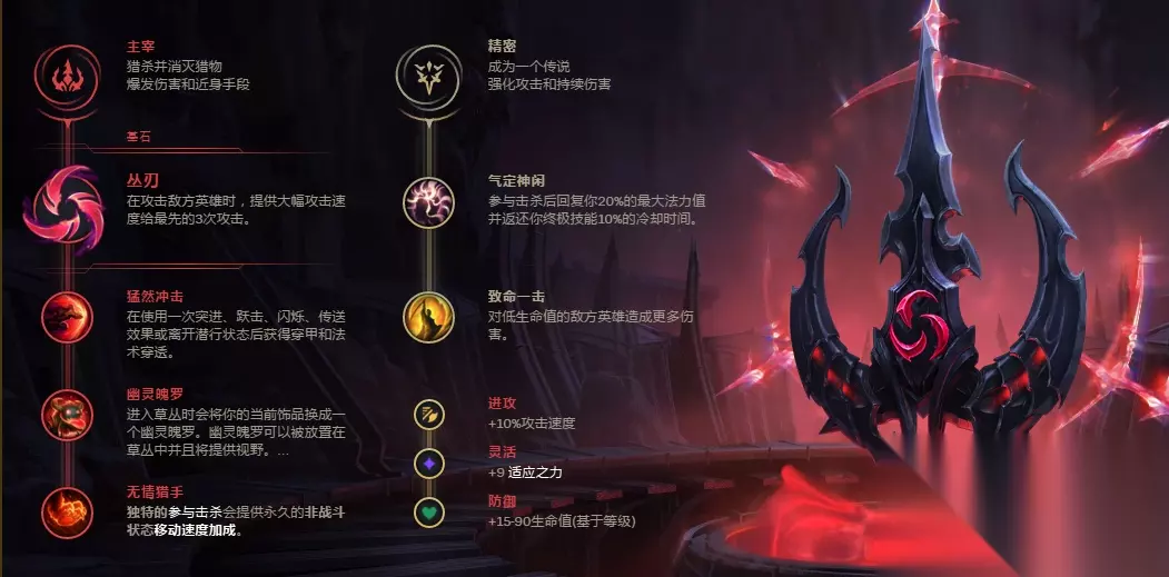 技能加点:主Q副E有R点R。 优势出装:出完血刃后出破败,攻速鞋,电刀,幽梦,重伤轻语。 大优势的话没什么好教的,反正见人就是上去砍砍砍。 劣势出装:出完血刃后出破败,魔抗鞋or护甲鞋(看对面主要输出位置)直接出肉。 剑圣强就强在收割能力强,但是收割能力强的前提就是要有生存时间,不然劣势的时候,往往剑圣很容易被集火秒掉。记住,出肉的话往往会给你更多的操作空间和更高的容错率。当然,如果对面肉多,那就需要持续输出的,天赋如下: