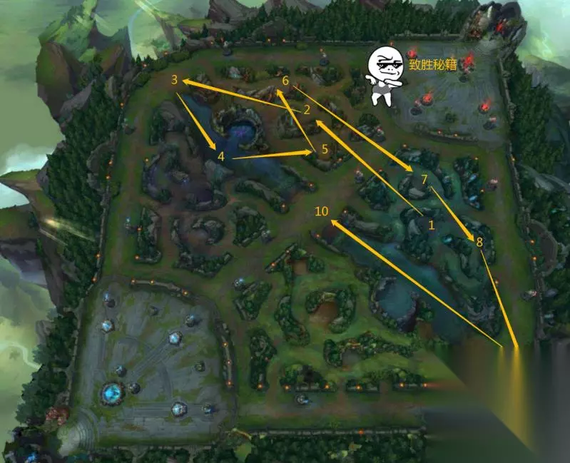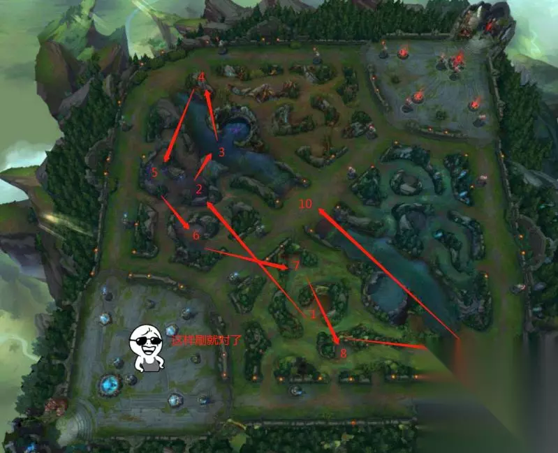 蓝色方刷野路线 蓝色方的话常规开完红蓝后看清线上局势后,要抢先把3号河蟹给刷了,红色方的刷野速度绝对是没有蓝色方块的。记住打野就是一场赛跑,你要比他刷野跑的比对面打野快,你高一级说不定在野区遇见他就根本打不过你了。你要gank比他快,反蹲比他好。这样你的剑圣的心得一定能有一定的提升。 刷完3后此时很有可能遇到对面打野,此时你要做的是,打的过,先消耗一波,打不过就遛……或者前往4号店进行反蹲,反蹲成功后看血量健康不健康,健康的话就继续刷,不健康的话就回家。 回家后从5开始刷起,看清线上局势,需要帮忙的话前往,和平发育的话就继续刷。剑圣前期没有红buff的粘人前期是很难留住对面的,除非有队友的配合,所以在排位时就可以请求队友选择带控制的英雄。你要记住,剑圣前期并不是很强势,你当个万年野并没有什么问题。只要帮队友做好反蹲,做好视野,及时控龙控buff,等你6级出山后,必定引起召唤师峡谷的一篇腥风血雨。