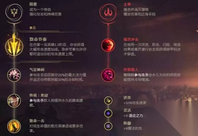 基石符文: 魔腾是一个比较依赖普攻进行输出的英雄,被动的物理伤害以及E技能恐惧之后进行的普攻输出都是魔腾不可或缺的输出手段,因此推荐点出致命节奏,可以大大增加魔腾短时间内的输出爆发,而且魔腾大招的CD太长了,所以还要点出气定神闲来尽量缩短魔腾的大招冷却时间,副系基石选择主宰,具体的符文鸽就放下面啦。
