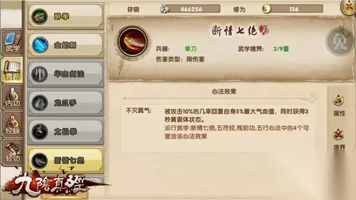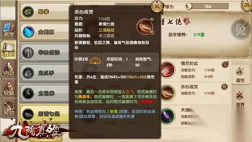 心法篇 同时运行五符经、残阳功、五行心法可以激活心法特效。被攻击有几率恢复自身气血,同时获得三秒的黄霸体状态。纵观断情七绝刀法,不管是控制亦或是霸体状态都兼而有之。就算以少敌多亦有逃生的可能或者强换对方一命的能力。黄霸体红霸体兼备三冲锋招式压制能力,江湖绝技不负其七绝之名。