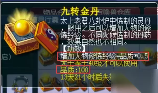 1、九转金丹的品质在获取它的时候会随机生成。 2、一般来说生成的品质都是10的倍数,最差的是10品质,其次是20品质、30品质以此类推,最好是100品质。