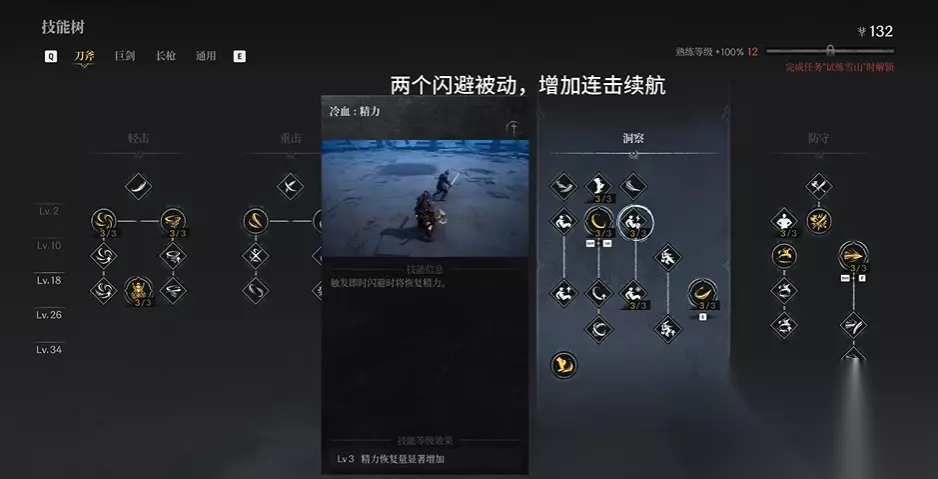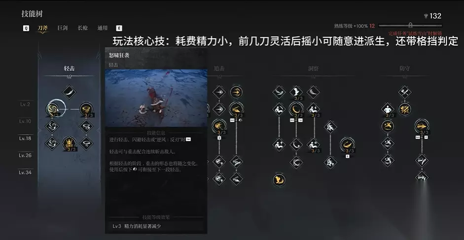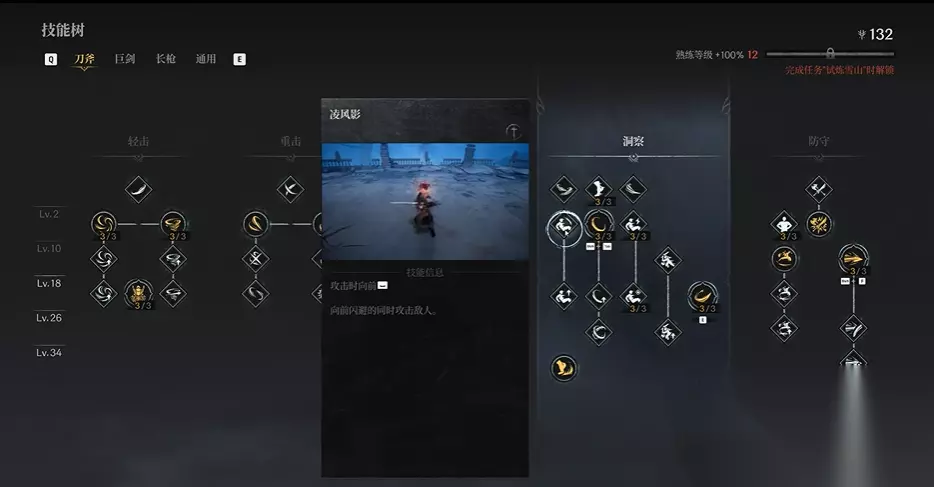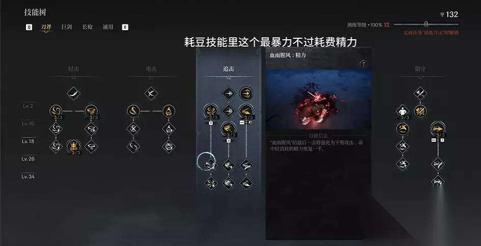 3、追击技能 血雨腥风(暴力爆发技) 血雨腥风:精力(降低精力消耗) 血雨腥风:坚韧(增加稳定性) 掠空斩(拼刀/输出技能) 掠空斩:坚韧 掠空斩:连破 4、策略技能 无我之境(长刀基础技能,适用于多种情况) 无我之境:解放(核心能力,可用于解除硬直并衔接半月斩) 逐影挥剑(轻-重派生互换) 逐影挥剑:冲击 逐影挥剑:破甲