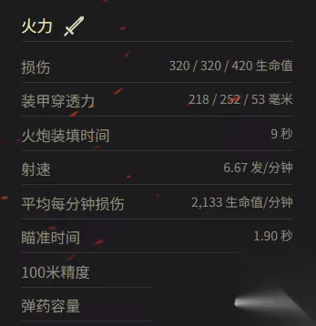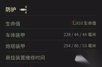 三、防护 生命值:1,910 生命值 车体装甲:228 / 44 / 44 毫米 炮塔装甲:254 / 86 / 53 毫米 悬挂装置维修时间:12.03 秒