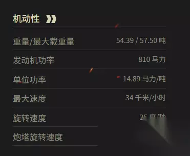 二、机动性 重量/最大载重量:54.39 / 57.50 吨 发动机功率:810 马力 单位功率:14.89 马力/吨 最大速度:34 千米/小时 旋转速度:25 度/秒 炮塔旋转速度:24 度/秒