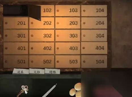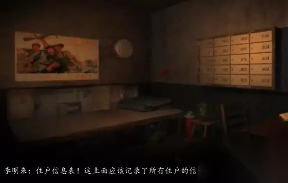 19、进入值班室,点击门牌表,使用404室邮箱钥匙打开404号柜,获取其中的404室门牌。 20、从值班室中出来,向右走,点击阅读海报,获取线索提示201。