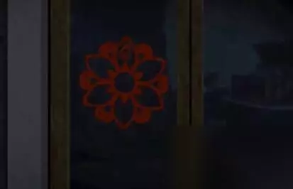 25、调查左起第一个窗户,在闪电时注意查看窗户,可看到窗花的最上方位置有火花标记。 26、查看并注意记下左起第二个窗户的窗花火焰标记位置。