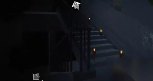 33、上楼,在2楼到3楼的楼梯间点击蜡烛参与小游戏。 34、根据在2楼的窗花上获取的线索,按照从左到右的窗户的顺序,按照上,左下,右下,下的顺序标记。 35、根据此线索提示,使用火柴盒按照图中标记的顺序点燃蜡烛即可。