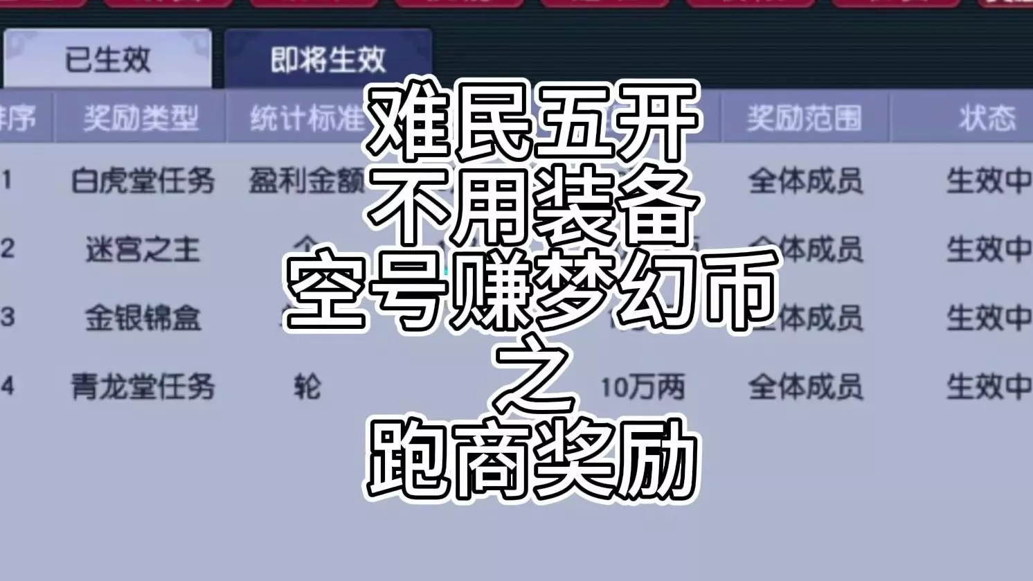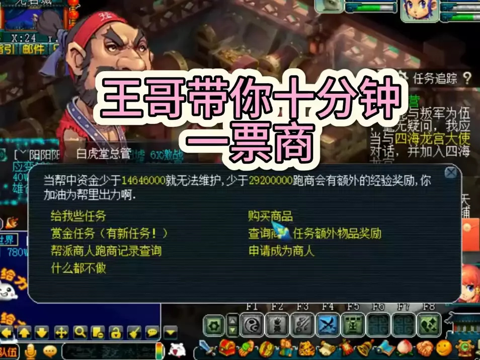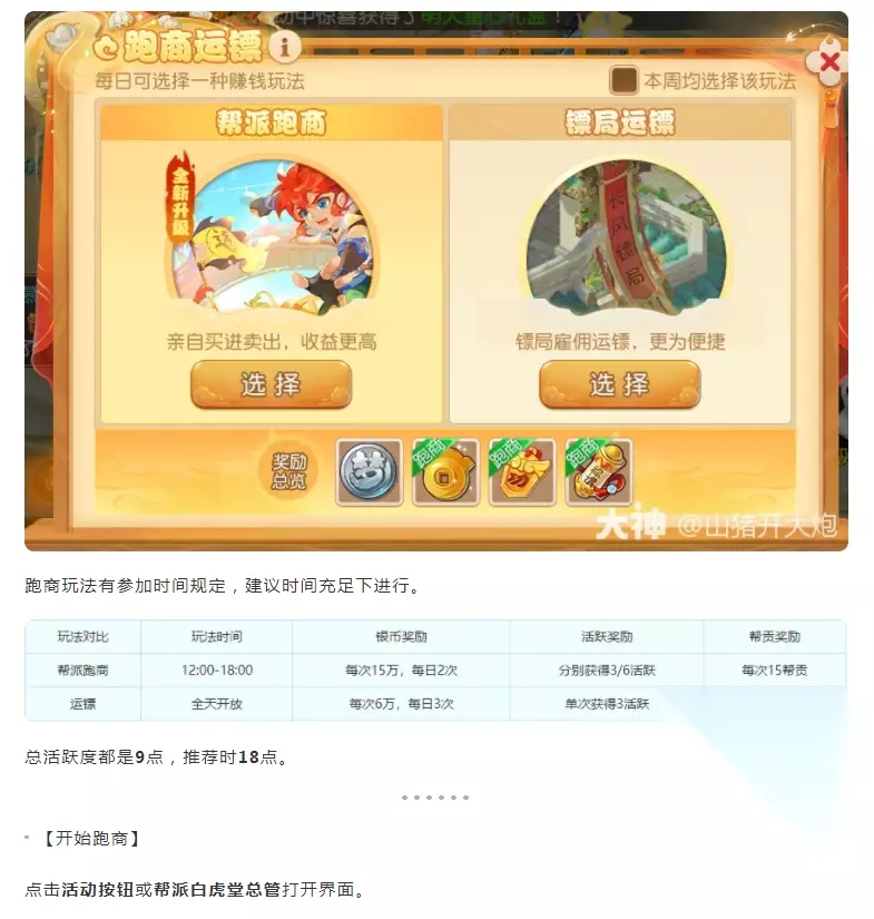 跑商小技巧 1.换线法 大家看着这个名字应该就明白了,《桃园》跑商任务系统所对应的6条线的价格都是不一样的,大家只要到其中一个[跑商商人]那里买进商品,换线到另一条线再卖掉就可以了,而且7条线里面总至少会有一条是有[稀少商品]、[特殊商品]或者[神秘商人]的,就看谁先抢到了。只能买稀少商品不买普通商品。 2.差价法 差价法就是大家最普遍使用的办法,就是在两个商人之间来回捣拭,当然要选择最佳的的路线来跑商。 1.大家要准备好活力马、火力酒,难免会发生意外 2.找好其中一个商人,经常换线,赚其中的差价 3.工艺品千万不能放过,不停的换线买到不能买为止,然后换线高价卖 4.丢失的货袋是一定要买的。 5.不要撒网太广泛,换线也就3.4个线差不多了 6.身上银两越多,交任务的时候帮会贡献会增加...本帮帮众有赚取过150W银两回去换的,大概得了200左右(感觉很坑爹) 7.请大家合理安排时间,我们不是土豪,所以10次跑商的12.5J的帮会资金对帮会非常有用!大家努力跑起来,争取早日升级!