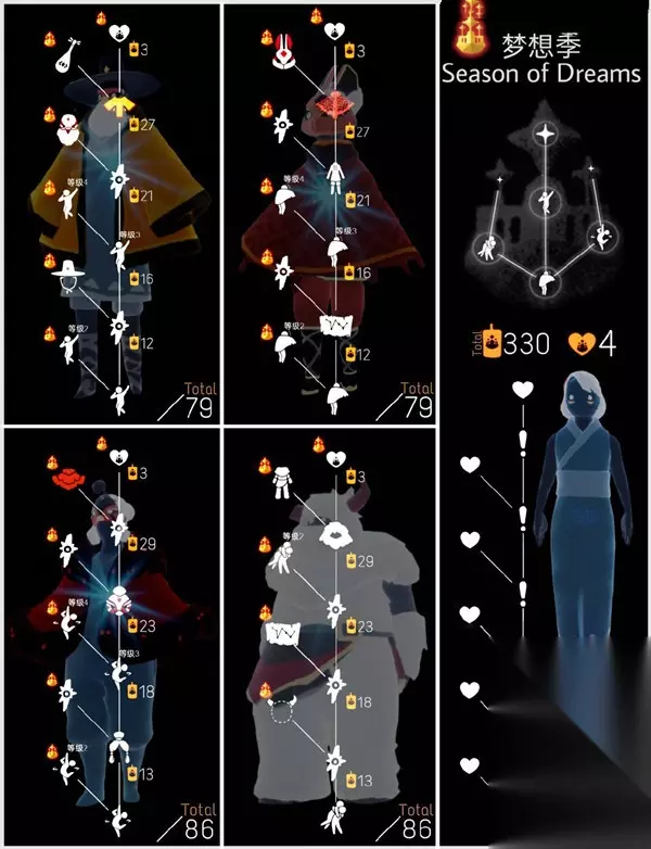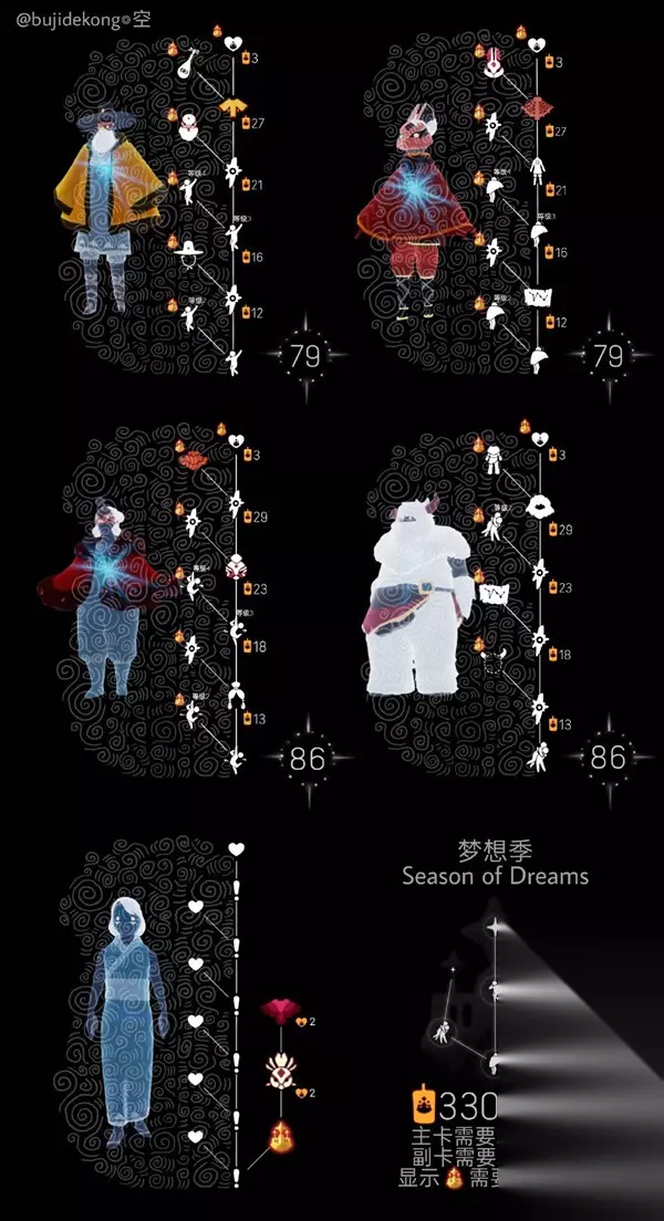 光遇【梦想季】全攻略 梦想季国际服已经开启,国服预计会在国际服之后开启 国际服预言季10月5日开启 梦想季1月4日开启 隔了91天,一共需要330季节蜡烛 主卡50天毕业 副卡52天毕业 季卡价格应该都是一样的,单人奇遇礼包68,多人分享礼包128!