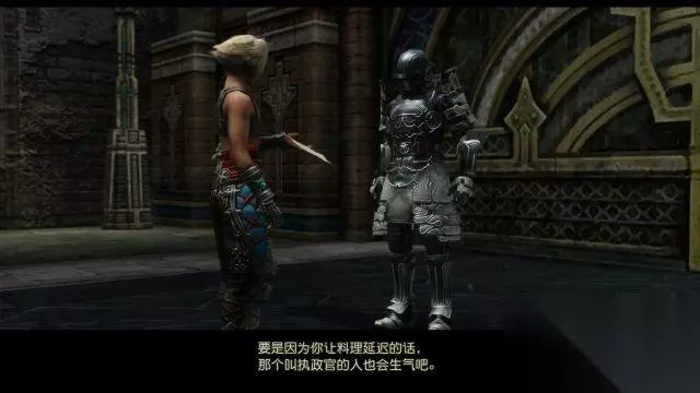 step7.返回到东城门,发现守卫已经彻底不让市民从东城门进入到王都内。 这时候梵恩可以跟凯兹对话,触发一段小剧情。守卫让昂贵的陆行鸟进入城内,也不让市民进入。趁大门打开期间,密捷罗先生立马用自己酿制的美酒贿赂守卫,这样才得以让梵恩和其他市民进入城内。