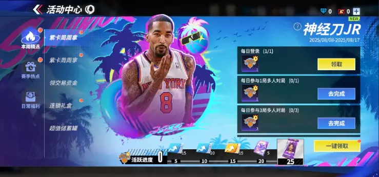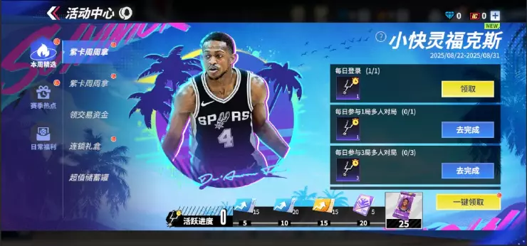相比较S2,我们降低了获取紫卡球星的难度,活跃进度调整为25即可获得紫卡球星,同时增加了紫卡周周拿活动的开放时间,兄弟们在活动期间只需要稍微活跃一下完成任务,即可快速获得紫卡球星。