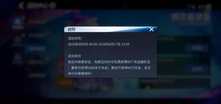 在S3赛季,领交易资金活动也会持续开启,我们增加了领交易资金活动可以获得的资金包的数量,每期活动共可免费获得的资金包数量从以往的30个调高到了60个,每一期领交易资金活动,最高可获得5000多万资金,最低可获得60万资金,去交易行运筹帷幄吧!