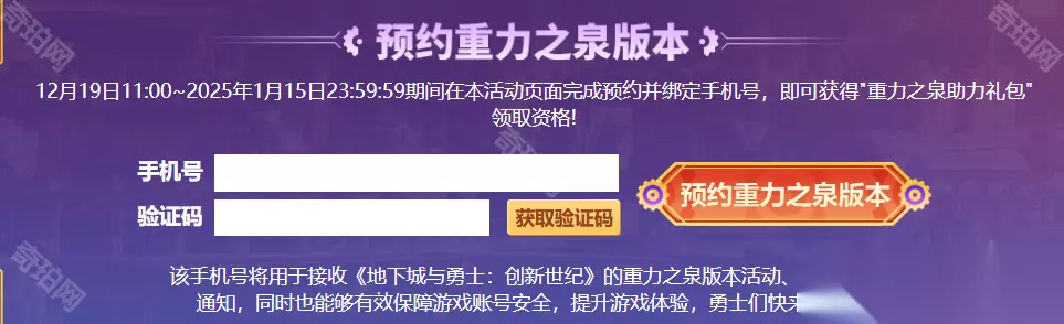 《DNF》115级版本攻略汇总 重力之泉版本预约活动奖励领取方法 一、活动介绍 12月19日11:00~2025年1月15日23:59:59期间 在活动页面完成预约并绑定手机号,即可获得"重力之泉助力礼包"领取资格