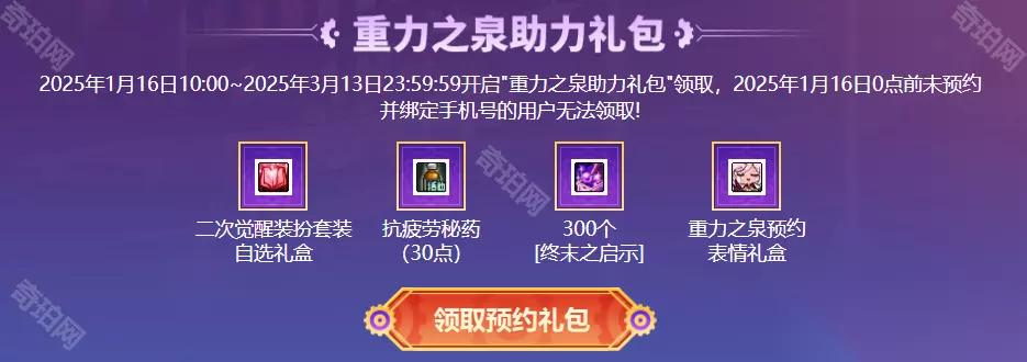 二、预约奖励领取方法 2025年1月16日10:00~2025年3月13日23:59:59开启"重力之泉助力礼包"领取 2025年1月16日0点前未预约并绑定手机号的用户无法领取! 三、预约奖励一览 二次觉醒装扮套装自选礼盒 抗疲劳秘药(30点) 300个[终末之启示] 重力之泉预约表情礼盒