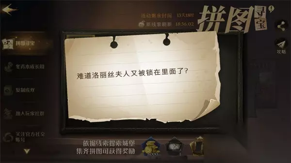 难道洛丽丝夫人又被锁在里面了是今天的拼图线索之一,相信很多的玩家都完成了任务,小编整理了一下,还没有完成任务的玩家赶紧来看看难道洛丽丝夫人又被锁在里面了拼图寻宝攻略吧。