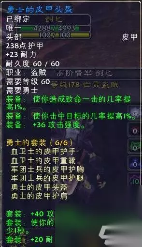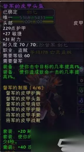 6件套 装备属性套装属性,联盟部落均一致,只是造型不同。野外击杀和战场击杀敌对阵营玩家获得荣誉后提升军衔获得,该套装需要军衔十三级联盟军衔达到元帅,部落军衔达到督军后才能完全解锁,获取难度很大,每天睁开眼睛就干架,不是在干架就是在去干架的路上,且需要坚持数月以上,至少需要2个肝才能获得~。至于造型,仁者见仁智者见智,不做讨论。 盗贼R13血量挺高,至于输出属性而言确实相对平庸了点,除了R13的腿,其他部件还不及T2.5死亡者行者。当然有信仰的盗贼要直接肝到R14拿武器的,顺便拿下R13套也还不错。