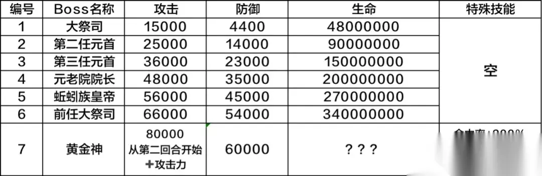 02蜣螂图特殊玩法总结 ● 除了最后一个Boss,其他Boss都属于剧情型Boss,请用攻击+追击的最强形态去打(例如异种形态、巨龙形态),国家特性必须带上吕布 ● 终极Boss是黄金神,无限血量,无法闪避、无法麻痹,但是可以暴击吸血,每回合+3W ● 站满20回合情况下,巧用吕布特性提高伤害 ● 站不满20回合的情况下,估计得用八岐大蛇特性,尽可能站更多回合 以上就是最强蜗牛蜣螂历史boss打法攻略的全部内容了,具体的技巧攻略大家应该也是知道的,剩下的就是去进行挑战了。