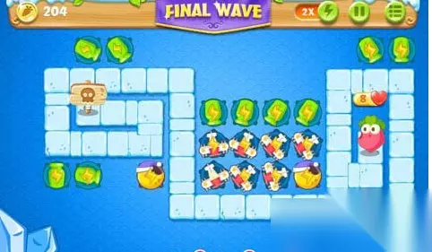 游戏一开始我们就要暂时暂停界面记下瓶子们的位置,然后开局放置一个冰锥去攻击上面的鸭子等着打右上角的瓶子,打出瓶子之后马上提升等级准备防御。然后清除剩下那个鸭子上面的两个瓶子打掉,打掉之后卖冰锥然后用来提升瓶子旁边两个绿瓶子的等级,把左边的瓶子也打掉。