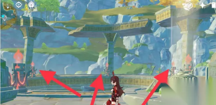 接着使用火元素攻击,击打三根长柱子下的火元素方碑进行激活,三个方碑激活后表面蓝色的屏障就会消失。