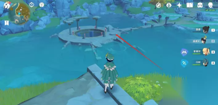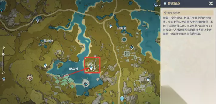 传送到下图红色箭头指示的传送锚点,位于渌华池右方。