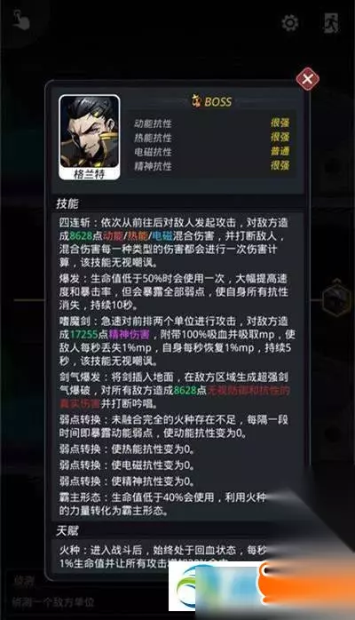 我就尝试打了一次,打掉三分之一血,就已经全灭了,都没见到他半血一下后的爆发。 目前已知的是,boss无视嘲讽,我主力队伍4人全部强50,整体战力8W+。 主站是守卫主角,云雀,三藏,克雷,除克雷外,人均只能抗住一刀(主角开盾除外)。 所以我第一次打的循环就是,三藏疯狂治疗,然后其他2人直接输出(克雷开场被满血一刀死),而且目测是少暴击的情况一下,人均抗住一刀,半血一下,个人感觉抗住一刀有点难。 其次就是主角开盾,确实能抗住很久,但boss有个减蓝debuff,再加上敌人只有一人。 主角霰弹回蓝无法抵御输出,楼主第一次打的时候,最后活下来的就是空蓝的主角。 上面就是跨越星弧格兰特最终BOSS打法攻略分享,更多最新最快的有关这款游戏的boss击杀技巧,请各位小伙伴们多多支持网!