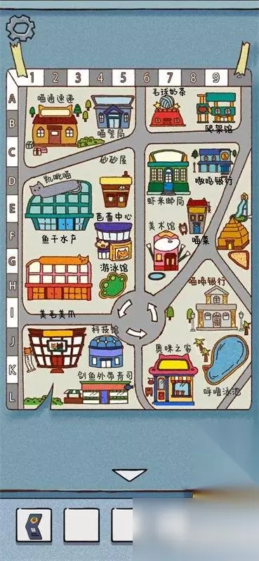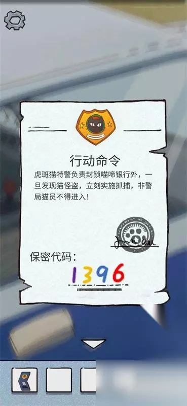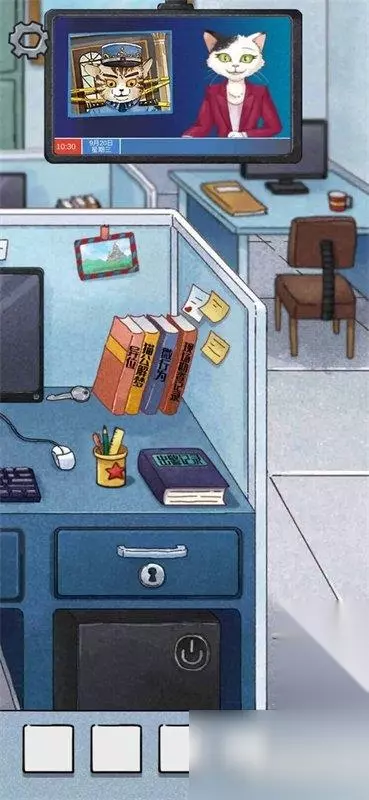 点击电脑开机键,输入警号9527,看到邮件中预告函说要去喵啼银行。 办公桌右侧墙上挂着地图,看到喵啼银行在I9。