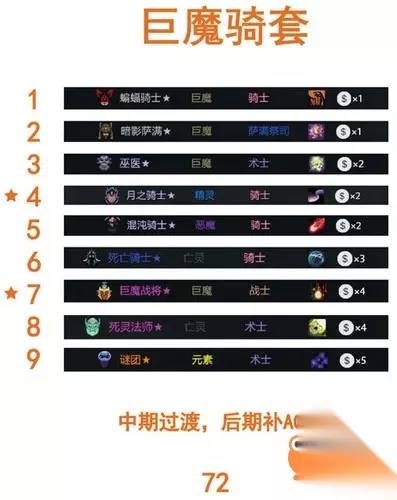 这套阵容,以月之骑士和巨魔战将为核心,前期尽量拿巨魔和骑士,凑2星。在还没抽到巨魔战将的时候可以先用骑士来过渡。骑士摆在前排,巨魔们摆在后排。利用骑士的减伤BUFF来让骑士承受伤害。 前期如果找不到死亡骑士也可以先用全能骑士来代替。谜团如果没有拿到可以用潮汐代替。但是尽量还是把三术士凑齐,因为三术士有一个吸血的BUFF,是非常契合这个阵容的。 成型过晚对这个阵容影响还是很大的,如果一直没有出关键棋子,比如巨魔、死灵,那么就要考虑转型了,发牌员给你的娜迦多,那么你可以考虑以大娜迦为主的阵容。 以上就是关于《多多自走棋手游》巨魔骑士流阵容推荐攻略的全部内容,更多精彩资讯尽在233乐园下载站!