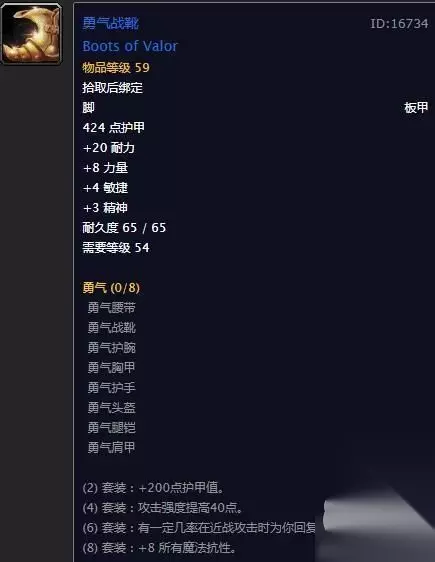 鞋子:勇气长靴 鞋子方面,亡骨马靴虽然拥有防御等级,但是掉率如同浮云一般,所以前期追求高耐鞋子即可。 勇气鞋子(20耐)和炮手鞋子(21耐)都是不错的入手目标。前者出自通灵学院的BOSS传令官,后者出自斯坦索姆血色区的BOSS炮手威利。