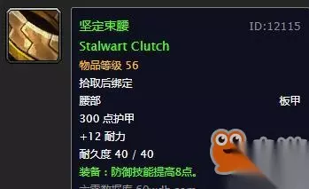 腰带:坚定束腰 虽然说是一件绿色装备,但是可以说是前期最好的防御腰带了...出自黑石深渊的任务:伊森迪奥斯。 比它更好的有通灵学院小BOSS掉落的亡骨束带,但是那个掉率...几乎是浮云一般的存在。