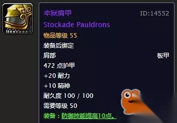 肩膀:牢狱肩甲 同样是装备后绑定的装备,花钱就可以搞定,这是团本之前防御能力最好的肩膀了。 当然,如果你没钱,可以选择去斯坦索姆刷稀有BOSS不可宽恕者掉落的哀嚎肩甲,3点防御,14耐力14力量,属性同样不错。