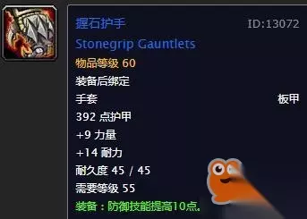手套:握石护手 又是一件装备后绑定的装备,是战士前期最好的防御手套。9力量14耐10防御等级,几乎是完美的前期属性配备。 备选方案是出自通灵学院小BOSS的亡骨护手,不过不推荐刻意去刷,因为掉率低到变态。