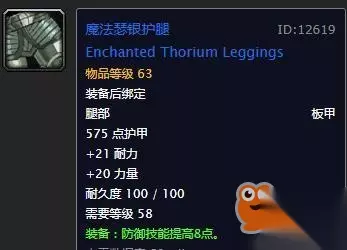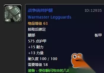 腿部:战争统帅护腿 虽然说没有防御等级,但是2躲闪相对来说也马马虎虎,在进团本之前,前期加防御等级的护腿入手难度都非常高,所以不建议刻意去追求。 这件护腿出自黑上BOSS雷德黑手,基本还算容易入手。