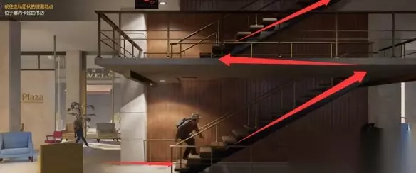 往右边走,进建筑,再走一点上楼。