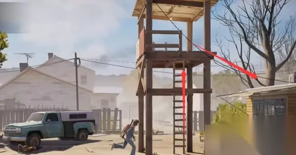 这里需要我们爬到哨塔上,然后按住shift跳过来。
