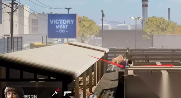 系簧枪(胜利肉类加工场) 到胜利肉类加工场后往右边走,穿过小棚子后,跳上去。
