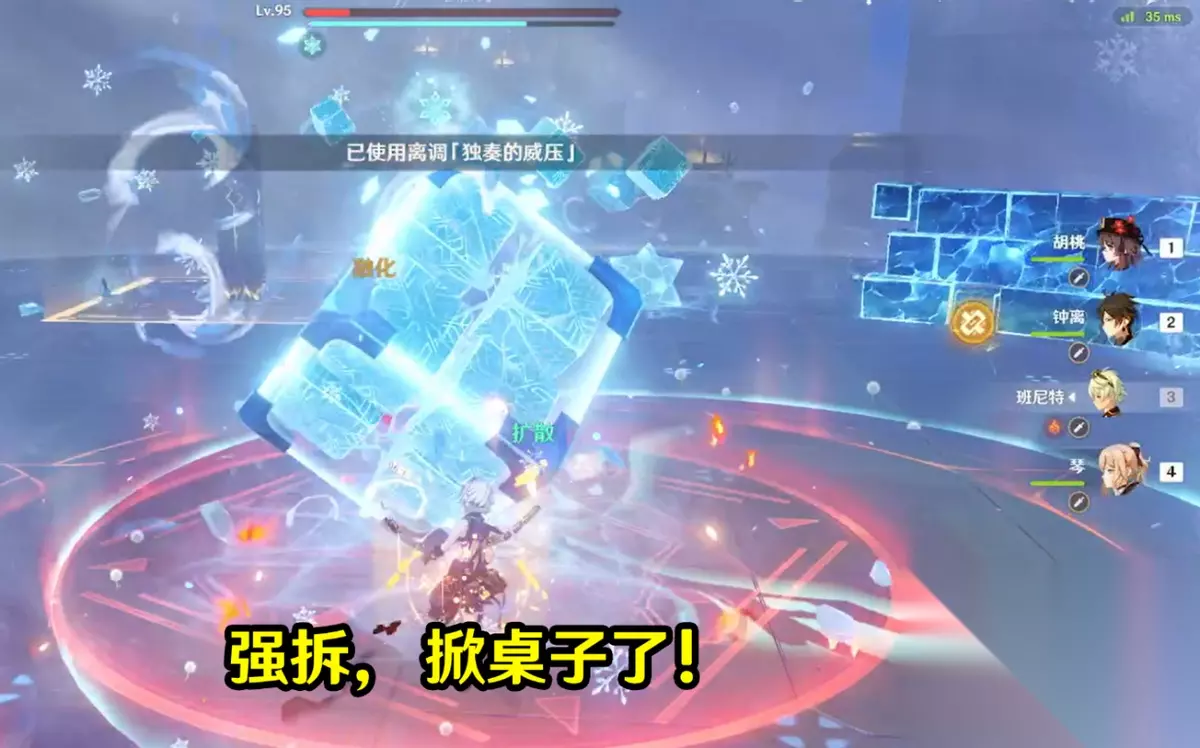 唯一难点,最终破盾阶段。注意无相冰的护盾本质上属于元素盾,是可以伤害强拆的。冻梨有2种处理方案可供参考:正常玩法,用弓箭手或重击手感好的角色击球破盾即可,2球后的残余盾量直接输出打破即可;强拆体系,目前最快的应该是火C+班尼特+琴+离调“独奏的危压”,上火硬拆。