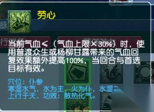 上面是普陀山第三层的经脉,该经脉效果是当前气血小于上限的30%时使用普渡众生或者杨柳甘露带来的气血回复效果额外提升100%,在任务中该经脉还是比较好用的,但是在pk的时候,该经脉却是拥有的负面效果的,那就是触发了经脉之后对战房就知道你的气血不多了,这样就有可能会被对方来一波点杀。 真是难为盲僧玩家了,现在买宝宝还需要计算属性点