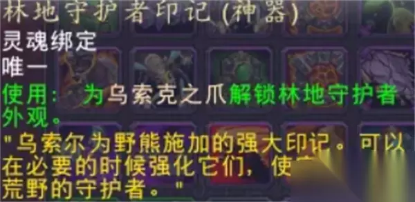 4、若未掉落,可更换副本难度重新挑战(每周每难度一次掉落机会)。 四、激活外观 1、获得林地守护者印记后直接右键使用;